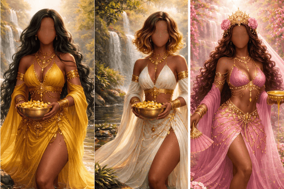 Oshun, Spirit of Sweet Water, is the embodiment of love and romance, wealth, beauty, abundance and magical knowledge. Oshun has dominion over things that flow: water, honey, love, money, mother’s milk and so forth.